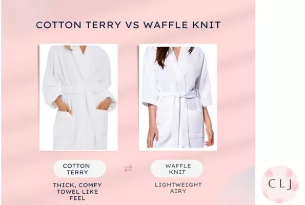 | Waffle Knit | lightweight and airy | Travel, gym, need multiple, such as for a group | Hot or humid | can be budget friendly, see in hotels, robe tends to dry quickly |